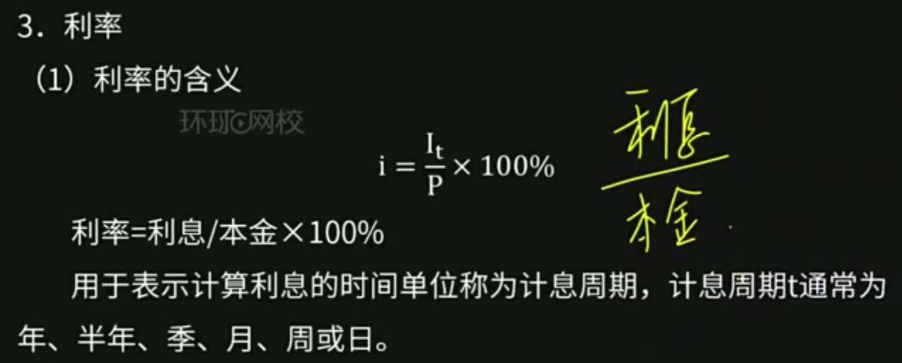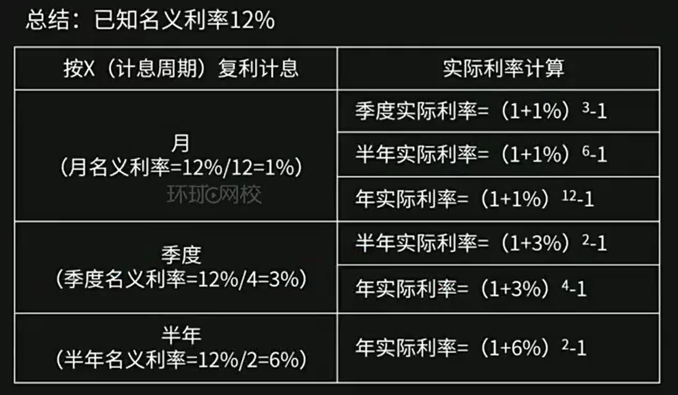 计息周期利率:按周期(年、半年、季、月)计算的利率,在名义利率的基础上做除法,如年利 12%,则季利为 12% / 4 = 3%;