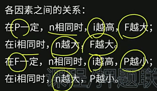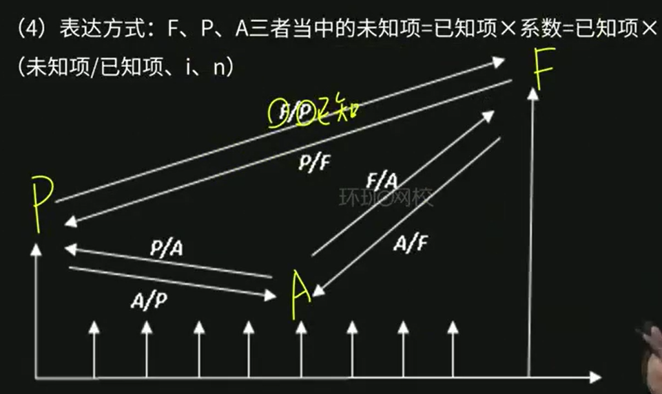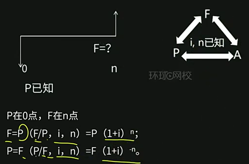 F:终值,P:现值,A:年金(每年都有的现金流),i:利率,n:期数;